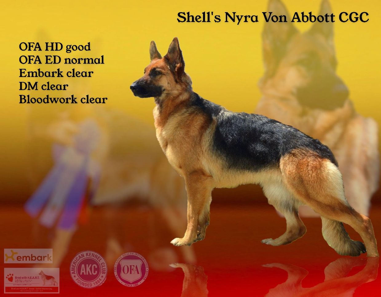 Nyra is CGC titled, OFA (Hips - Good) and OFE (Elbows - Normal) certified, DM (clear) tested, and carrier of the long coat. When you see her remarkable structure, you know you are looking at an exceptional quality dog. When you combine all this with the absolutely stunning coat colors and unequaled desire to please, you have the perfect dog. If you get a Nyra puppy, you are sure to get a phenomenal German Shepherd!